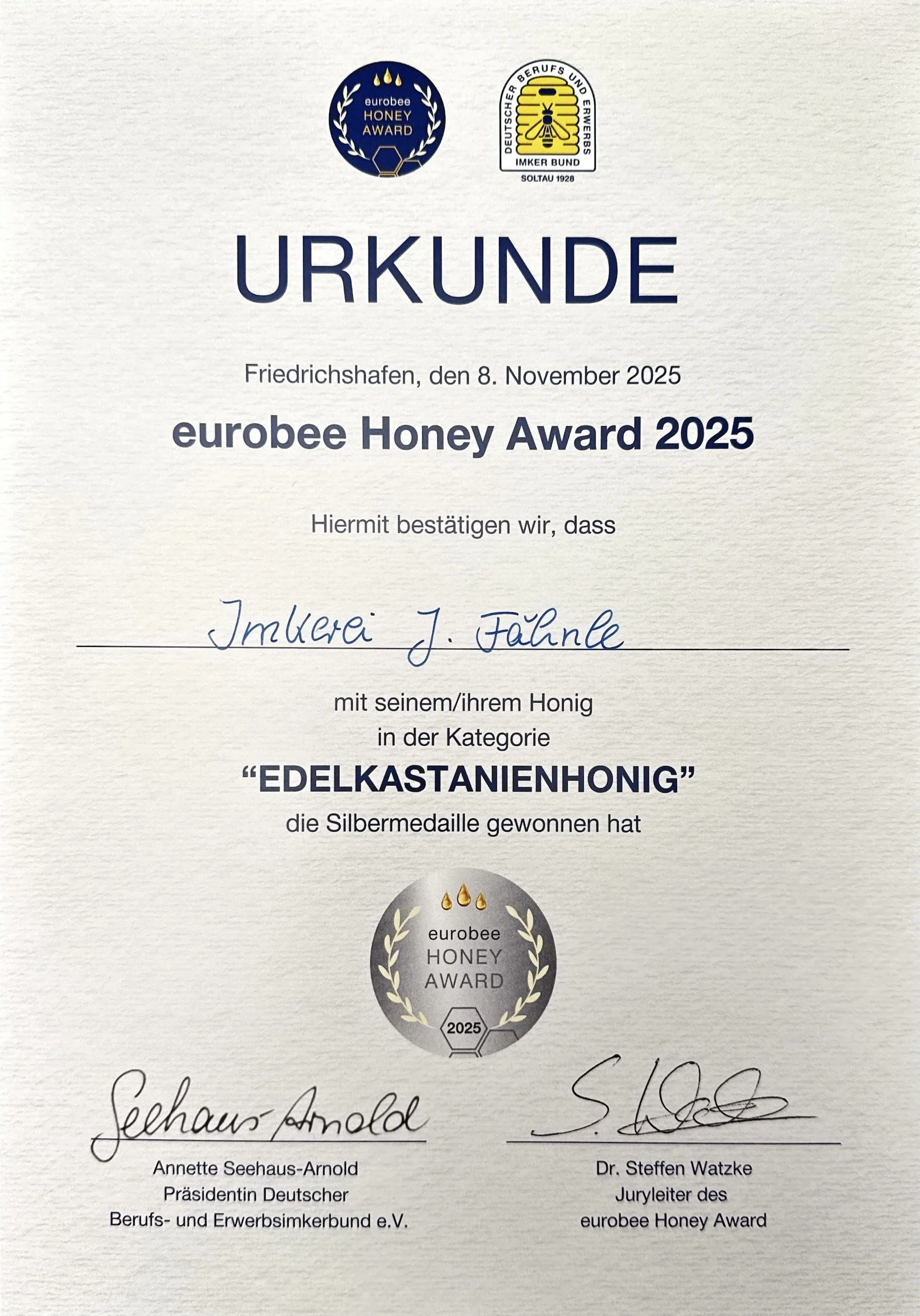 Unser Edelkastanienhonig wurde beim Eurobee Honey Award 2025 mit der Silbermedaille ausgezeichnet – als zweitbeste Einsendung Deutschlands in der Kategorie Edelkastanie.