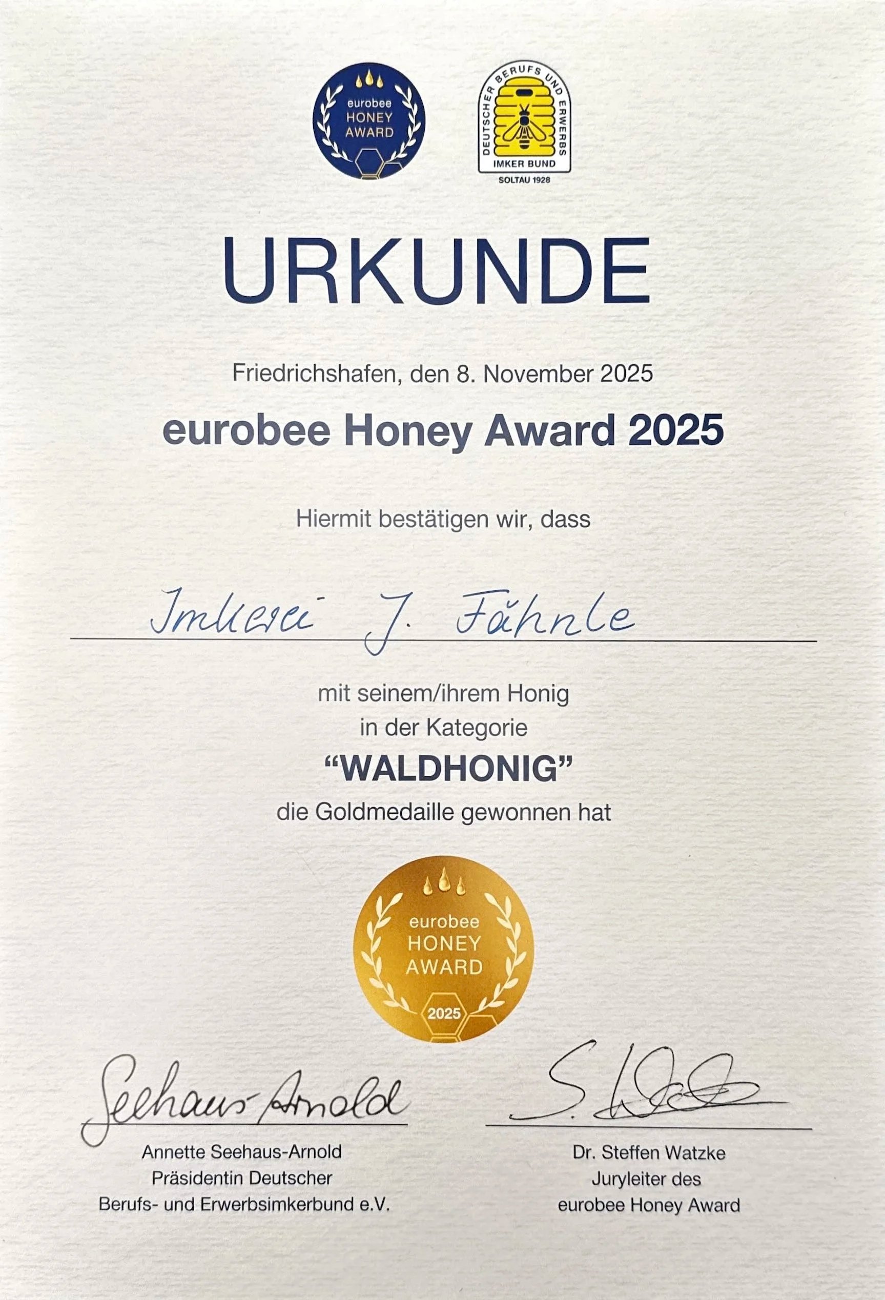 Unser Deutscher Waldhonig hat beim eurobee Honey Award 2025 die Goldmedaille gewonnen – und wurde damit als bester Waldhonig Deutschlands ausgezeichnet.